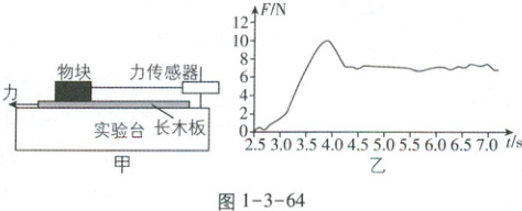 【解析】力传感器与物块用棉线连接,物块受力平衡,力传感器所测量的力的大小等于摩擦力的大小,而物块所受摩擦力的大小与木板是否匀速运动无关,A错误;图1-3-64乙为传感器所受棉线拉力随时间的变化曲线,B错误;从图1-3-64乙可看出传感器所受拉力的最大值约为 $ 10 \, N $,此时木板与物块刚要滑动,即物块与木板间的最大静摩擦力约为 $ 10 \, N $,$ t = 4.5 \, s $ 以后,传感器所受拉力基本不变,大小约为 $ 7 \, N $,可知此时木板与物块相对滑动,传感器的示数等于滑动摩擦力的大小,即最大静摩擦力与滑动摩擦力之比约为 $ 10:7 $,C正确;根据图1-3-64乙只知道滑动摩擦力的大小,物块质量未知,故无法得到物块与木板间的动摩擦因数,D错误.