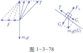 【解析】对小滑块进行受力分析,设小滑块与圆心的连线与竖直方向的夹角为 $ \theta $,凹槽对小滑块的支持力为 $ N $,则有 $ F = mg \sin \theta $,$ N = mg \cos \theta $,$ \theta $ 由 $ 0^{\circ} $ 增加到 $ 90^{\circ} $ 的过程中,推力 $ F $ 一直增大,凹槽对小滑块的支持力 $ N $ 一直减小,故A、B错误;对凹槽和小滑块整体进行受力分析,如图1-3-80所示,设地面对凹槽的支持力为 $ N_{1} $,墙面对凹槽的压力为 $ N_{2} $,则由平衡条件可得 $ N_{2} = F \cos \theta $,$ N_{1} + F \sin \theta = (M + m) g $,联立可得 $ N_{2} = \frac{1}{2} mg \sin 2\theta $,$ N_{1} = Mg + mg \cos^{2} \theta $,可知 $ N_{2} $ 先增大后减小,$ N_{1} $ 一直减小,故C正确,D错误.
