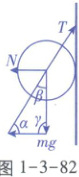 【解析】设两细绳对圆柱体的拉力的合力为 $ T $,木板对圆柱体的支持力为 $ N $,细绳与木板夹角为 $ \beta $,从右向左看如图1-3-82所示,在矢量三角形中,根据正弦定理 $ \frac{\sin \alpha}{mg} = \frac{\sin \beta}{N} = \frac{\sin \gamma}{T} $,在木板以底边 $ MN $ 为轴向后方缓慢转动直至水平过程中,$ \alpha $ 不变,$ \gamma $ 从 $ 90^{\circ} $ 逐渐减小到 $ 0^{\circ} $,又 $ \gamma + \beta + \alpha = 180^{\circ} $,且 $ \alpha < 90^{\circ} $,可知 $ 90^{\circ} < \gamma + \beta < 180^{\circ} $,则 $ 0^{\circ} < \beta < 180^{\circ} $,可知 $ \beta $ 从锐角逐渐增大到钝角,根据 $ \frac{\sin \alpha}{mg} = \frac{\sin \beta}{N} = \frac{\sin \gamma}{T} $,由于 $ \sin \gamma $ 不断减小,可知 $ T $ 不断减小,$ \sin \beta $ 先增大后减小,可知 $ N $ 先增大后减小,结合牛顿第三定律可知,圆柱体对木板的压力先增大后减小,设两细绳之间的夹角为 $ 2\theta $,细绳拉力为 $ T' $,则 $ 2T' \cos \alpha = T $,可得 $ T' = \frac{T}{2 \cos \alpha} $,$ \theta $ 不变,$ T $ 逐渐减小,可知细绳拉力不断减小,故B正确.