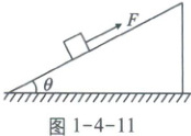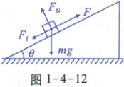 【解析】在最初的$2\ s$内,物体在$F = 9.6\ N$的拉力作用下,从静止开始沿斜面做匀加速直线运动,受力分析如图1-4-12所示,设沿斜面向上为正方向,根据牛顿第二定律可知$F - mg\sin \theta - F_{f} = ma_{1}$,$F_{N} = mg\cos \theta$,且$F_{f} = \mu F_{N}$,解得$a_{1}= \frac{F - mg\sin \theta - \mu mg\cos \theta}{m}= 2\ m/s^{2}$。$2\ s$末撤去拉力,物体的瞬时速度$v_{1} = a_{1}t_{1} = 4\ m/s$,从撤去拉力,物体继续沿斜面向上运动达到速度为零的过程,物体不再受拉力$F$的作用,其他力情况不变,则加速度$a_{2}= \frac{-(mg\sin \theta + \mu mg\cos \theta)}{m}= -7.6\ m/s^{2}$,经历的时间为$t_{2}= \frac{0 - v_{1}}{a_{2}}\approx 0.53\ s$;再设物体沿斜面下滑过程中加速度为$a_{3}$,到物体的速度大小达到$v_{3} = 22\ m/s所用时间为t_{3}$,则由牛顿第二定律和运动学的基本公式,得$a_{3} = \mu g\cos \theta - g\sin \theta = -4.4\ m/s^{2}$,$t_{3}= \frac{-v_{3} - 0}{a_{3}} = 5\ s$,综上所述,从撤去拉力到物体速度达到$22\ m/s所经历的总时间为t = t_{2} + t_{3} = 5.53\ s$。