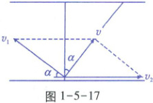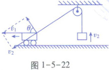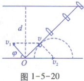 (3) 当水的流速 $ v_{2} = 5 \, m/s $ 大于船在静水中速度 $ v_{1} = 4 \, m/s $ 时,船不能垂直河岸渡河,由图 1 - 5 - 20 可知,船的航程 $ s = \dfrac{d}{\cos \varphi} $,欲使船渡过河的航程最短,航行的方向与河岸的方向的夹角 $ \varphi $ 应为最小. $ \varphi $ 在 $ 0^{\circ} \sim 180^{\circ} $ 变化的过程中,合速度 $ v $ 的大小和方向都在发生着变化,但 $ v $ 与 $ v_{1} $、$ v_{2} $ 的矢量关系遵循平行四边形定则,利用直角三角形知识可求得