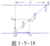 由上式可知,当 $ \sin \alpha = 1 $,即 $ \alpha = 90^{\circ} $ 时,$ v_{\perp} $ 最大,$ t $ 最小,此时船身垂直于河岸,航向(船头方向)始终指向正对岸,如图 1 - 5 - 18 所示. 最短时间为