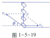 (2) 在船速 $ v_{1} = 4 \, m/s $ 大于水速 $ v_{2} = 3 \, m/s $ 的情况下,欲使船以最短位移渡河,可使船头即航向斜向上游一定角度(设与上游河岸夹角为 $ \theta $),使船的实际速度(合速度 $ v $)的方向与河岸垂直指向正对岸,如图 1 - 5 - 19 所示. 这时船的实际位移大小等于河宽 $ d $,位移最短,航程最短,这时船垂直于河岸渡河.