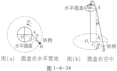 (1) 在图1-6-34(a)中,若圆盘在水平雪地上以角速度$\omega_{1}$匀速转动,转椅运动稳定后在水平雪地上绕$O点做半径为r_{1}$的匀速圆周运动. 求$AB与OB之间夹角\alpha$的正切值.