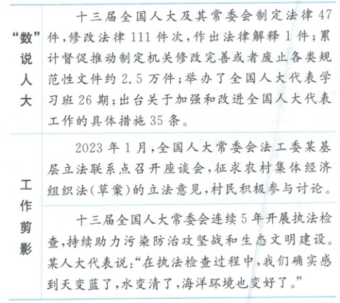 党的十八大以来,以习近平同志为核心的党中央全面加强对人大工作的领导,人大工作取得历史性成就,人民代表大会制度更加成熟更加定型。某校以“人民代表大会制度更加成熟更加定型”为主题策划展览,以下为部分展出材料: