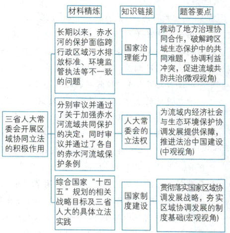 【解析】本题考查人民代表大会制度、全面依法治国。设问要求说明三省人大常委会开展区域协同立法的积极作用,分析材料,主要体现了三省人大紧紧围绕党和国家的工作大局展开相关的立法工作,以贯彻落实中央的大政方针和决策部署,故可从“流域生态问题的解决”“提供流域内协调发展的法律保障”“贯彻落实国家发展战略”三个维度展开阐释即可。