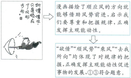 “任运”“随风”强调规律的客观性,但不涉及发挥人的主观能动性,②不符合题意;“逆势而动”与漫画中的“顺应”不符,④排除。