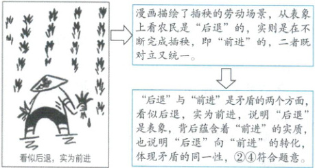 矛盾双方存在明确的不容模糊的界限,①错误。漫画没有体现矛盾双方的斗争性,③不符合题意。