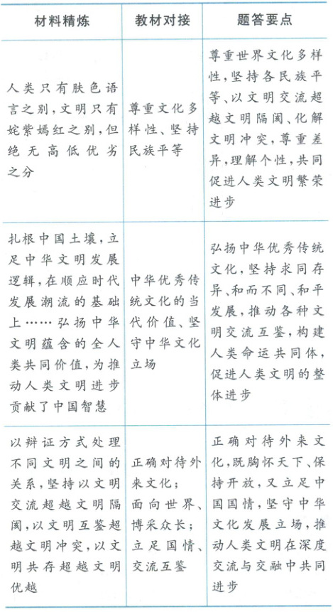 【答案】尊重世界文化多样性,坚持各民族平等、以文明交流超越文明隔阂、化解文明冲突,尊重差异,理解个性,共同促进人类文明繁荣进步;(2分)弘扬中华优秀传统文化,坚持求同存异、和而不同、和平发展,推动各种文明交流互鉴,构建人类命运共同体,促进人类文明的整体进步;(2分)正确对待外来文化,既胸怀天下、保持开放,又立足中国国情,坚守中华文化发展立场,推动人类文明在深度交流与交融中共同进步。(2分)