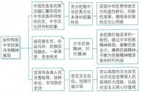 【答案】①中华优秀传统文化源远流长、博大精深,是中华民族的“根”与“魂”,是中华民族凝聚力和发展动力的重要来源。要推动实现中华优秀传统文化创造性转化、创新性发展,树立和突出各民族共享的中华文化符号和中华民族形象,塑造中华文化的丰满形象和精神面貌。(1 分)②中华民族精神集中体现了中华民族的整体风貌和精神特征,体现了中华民族共同的价值追求。在新时代,应在中国共产党人的领导下,凝聚民族合力、赓续民族精神,不断为民族精神增添新的时代内容。(2 分)③中国共产党正是以高度的文化自觉与文化自信,带领全国人民取得了革命、建设、改革的伟大胜利和辉煌成就。新时代构筑中华民族共有精神家园,要继续增强中华文化自觉,坚定中华文化自信。(2 分)④要弘扬社会主义核心价值观,发挥其在全社会价值追求“最大公约数”中的作用,深化爱国主义教育,凝聚中华民族共有精神家园价值追求,引领中华民族共有精神家园的建设与发展。(2 分)