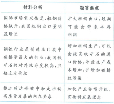 【答案】①经济全球化背景下,随着国际市场需求恢复,粗钢价格飙升,我国粗钢出口量明显增长,有利于充分利用全球资源和市场,参与竞争,推动我国钢铁行业发展。②我国对于粗钢生产原料的铁矿石缺乏定价权,严重依赖进口,且近年来铁矿石价格提高,盲目扩大粗钢生产可能会进一步拉高铁矿石价格,压缩粗钢生产利润。③钢铁行业对于碳排放问题的解决至关重要,为推动我国经济高质量发展,建设现代化经济体系,钢铁行业不能盲目扩张,走高耗能、高污染、低附加值的老路,必须贯彻新发展理念,深化供给侧结构性改革,有效化解过剩产能,同时提高自主创新能力,依靠技术进步提高产品附加值,形成竞争优势,延长产业链,充分利用两种资源、两个市场,推动钢铁产业可持续发展。(10 分)