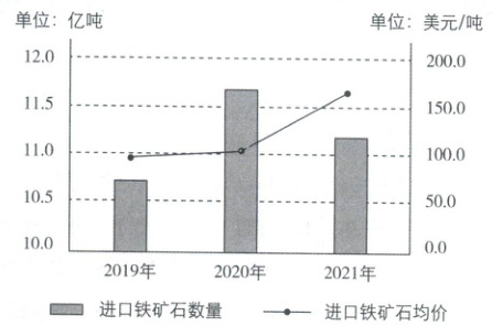 材料二 铁矿石是生产粗钢的重要原材料之一。我国铁矿石的对外依存度超过 80%,而且缺乏定价权。下图是 2019 - 2021 年我国铁矿石进口情况。