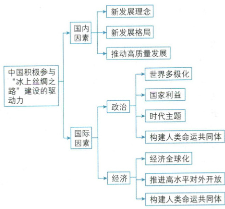 【解析】本题考查贯彻新发展理念、推动高质量发展、世界多极化、经济全球化。设问要求分析中国积极参与“冰上丝绸之路”建设的驱动力,考查范围是经济与社会、当代国际政治与经济,属于跨模块融合类试题。根据设问可知,“冰上丝绸之路”建设的驱动力包括了国内因素和国际因素,同时,设问也可转述为中国积极参与“冰上丝绸之路”建设的原因,可从现实因素和理论因素两个角度去思考。