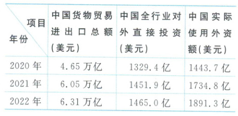 例403 [辽宁 2023·11]2023 年 2 月,全球多个主要经济体公布 2022 年对华贸易年报,韩国、德国、英国和欧盟对华投资较上年增幅分别为 64.2%、52.9%、40.7%和 92.2%。结合材料及下表(数据来源:新华通讯社),可以推断出 (