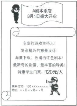 “红色剧本杀”以角色扮演方式在游戏中传承红色基因,这种沉浸式体验深受青少年喜爱。A 剧本杀店张贴海报(如图),吸引玩家纷至沓来。某日,大三学生小明约同学去该店玩以某英雄连事迹为主线的情景式剧本杀。在游戏过程中,小明发现剧本内容包含对某英烈的侮辱性言辞。震惊之余,小明与主持人发生争执,不牢固的布景装置导致了小明小腿骨折。小明向执法机关举报了该店。
