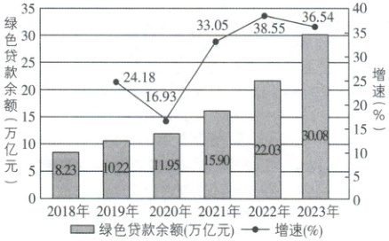 贷款余额是指在某一时间点上银行尚未收回的各类贷款本金总额,反映银行的信贷规模。截至2023年末,中国银行等六大国有银行的绿色贷款余额达17.86万亿元。下图是2018—2023年我国金融机构绿色贷款余额及其增长情况。据材料,可以推断出(