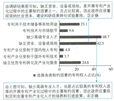 根据调研结果中选择专利技术与市场脱节为主要制约因素的占比仅有9.6%,可知大部分专利权人并不认为其是专利产业化过程中的核心影响因素,因此加强专利技术交易市场或平台建设不应是工作重心,①排除。我国专利产业化受制于国外专利技术,要加强自身人才培养,推动技术创新,不能主要通过激励企业购买和引进国外专利技术来解决问题,②排除。