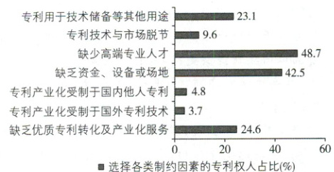 2022年,国家知识产权局对全国20余个省(区、市)1万多个专利权人开展专利产业化过程中的主要制约因素专题调研。调研结果见下图。