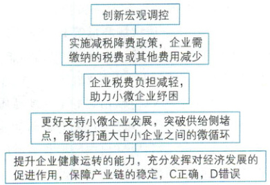 材料强调通过减税降费,有效维护了我国产业链供应链安全稳定和自主可控,并未涉及高新技术企业创新,②排除;通过减税降费能帮助小微企业纾困解难,但无法实现关键技术完全自主创新,③排除。