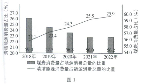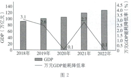 例71 [山东2023·3]图1是2018—2022年我国煤炭和清洁能源消费量占能源消费总量的比重变化情况,图2是2018—2022年我国GDP、万元GDP能耗降低率变化情况。据此,下列推断正确的是(