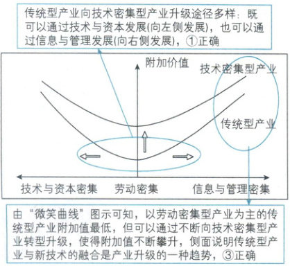 从传统型产业向技术密集型产业升级是产业升级的重要方向和趋势,但技术密集型产业向传统型产业转化并非产业升级发展的内在要求,二者相互转化的说法不妥,②错误;要推动传统型产业转型升级,但技术密集型产业不会完全替代传统型产业,④错误。