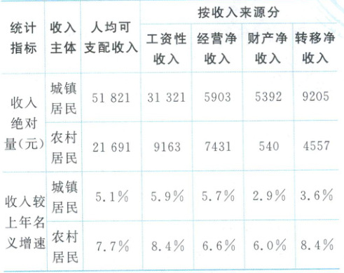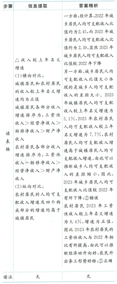 例 103 [湖北 2024·3]下表反映了 2023 年我国城乡居民人均可支配收入及其来源结构情况。