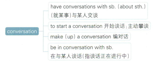 (2)conversation 是名词,意为“谈话;交谈”,常指非正式的谈话或交谈。常用的搭配有: