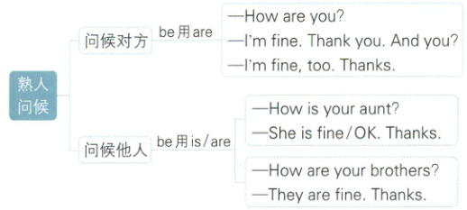 (1)这是熟人见面时常用的问候语,常用于询问身体状况。回答可以是“ Fine./I'm fine,thanks."或“ I'mOK,thankyou."等。同时,出于礼貌通常在答语后用“ How are you?"或“ And you?"进行回问,其答语为“ T'm fine,too.Thanks."等。