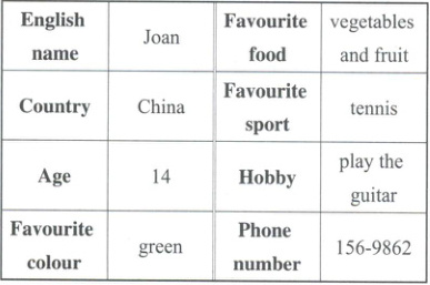 She is a cute girl from China. Her English name is Joan. She is 14 years old. Her favourite colour is green. She likes eating vegetables and fruit. Her favourite sport is tennis. She also likes playing the guitar because it is interesting. Her phone number is 156 - 9862. Would you like to make friends with her?