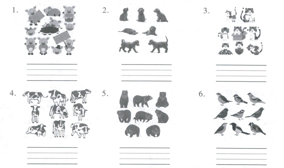 Ⅰ. 动物园里有不少动物。请你听一听,根据你所听到的单词圈出相应图片的数量,并在图片下方的四线三格上写出相应的数字,每个单词读两遍(每小题2分,共12分)