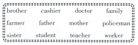 1. family 2. father, farmer 3. mother, cashier 4. sister, doctor 5. brother, policeman 6. student