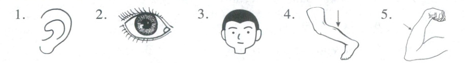 1. ear 2. eye 3. head/face 4. leg 5. arm