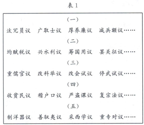 (1)根据表2中该书成书时间1861年以及表1中“广取士议”“该科举议”“制洋器议”“善制夷议”等分析。