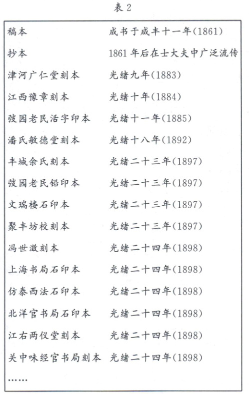(2)从表2中看得出该书成书于1861年,成书后抄本在士大夫中广泛流传,但短期内并没有正式刊刻出版,说明书中学习西方以改革自强的主张超前于作者所处的时代和社会,并没有付诸实践。19世纪80年代,随着民族危机的加深和洋务运动的推动,该书逐渐有了民间刊刻版本,说明洋务运动推动了中国近代化进程,向西方学习的主张更容易被接受。1895年的背景下广泛刊印并流行,这反映了在民族危机空前严重的背景下,中国人民学习西方逐渐从器物层面上升到制度和文化层面,资产阶级维新派登上政治舞台,开展了维新变法运动,维新变法的内容深受该书的影响,故该书在19世纪90年代大量刊印并发行,一定程度上指导了维新变法运动并促进了民众的思想解放和社会转型。该书大规模刊刻印刷要到成书30多年后,从侧面反映了近代思想解放的阻力之大。通过统计分析该书成书时间、刊刻出版的概况可从侧面了解作者所处时代的社会背景和该书的影响,具有很强的史料价值。