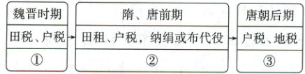 (1) 下表反映了魏晋南北朝至隋唐时期赋税制度的变化,图中方框①②③内应填写的分别是(