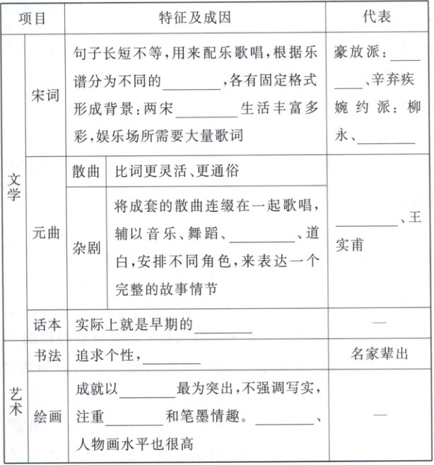 词牌;城市;苏轼;李清照;关汉卿;表演;白话小说;不拘法度;山水画;意境;花鸟画