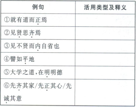 ①形容词作动词,匡正、端正 ②贤,形容词作名词,有贤德、有才华的人;齐,形容词作动词,与……看齐 ③名词作状语,在内心 ④形容词作动词,填平 ⑤形容词作动词,彰明 ⑥使动用法,齐,使……整齐有序;正,使……端正;诚,使……真诚