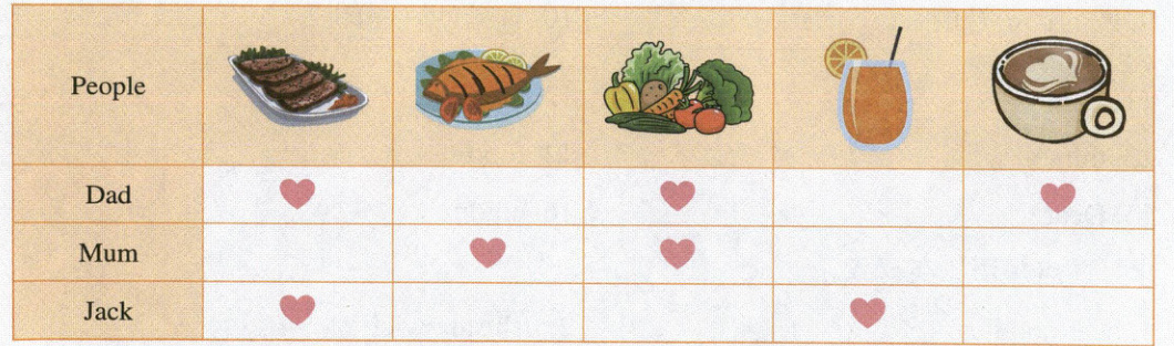 Ⅹ.Jack 发现就算是一家人每天一起吃饭,各自的喜好也不相同。根据他的调查结果,判断下列对话是(T)否(F)正确 ❤️= Favouri