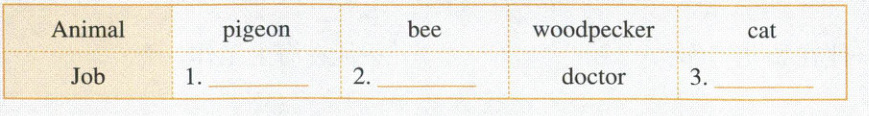 Do you know pigeons? What do they do? They are postmen. They can fly and send letters to people. Bees are good workers. They work very hard. They can collect pollen (花粉) and nectar (花蜜). Woodpeckers are good doctors for the trees. They can eat the worms (虫子) in the trees and make the trees healthy. What about cats? They are good police officers. They can help us catch mice.