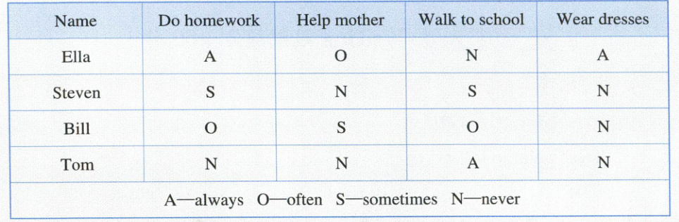 任务一:1. often 2. sometimes 任务二:1. Always. 2. Steven, Bill and Tom. 3. Never.