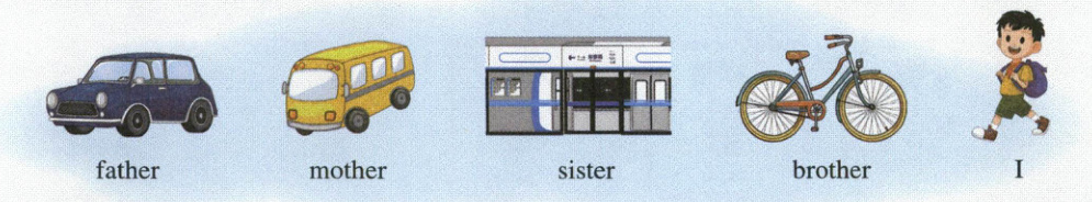 文明出行,快乐随行。请根据下列图片提示,描述你的家庭成员上班或上学的出行方式,不少于 6 句话。