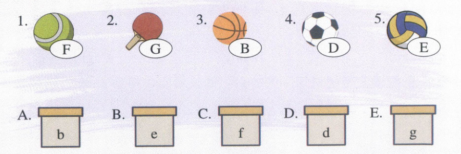 Ⅴ. 体育课结束后,Jack 在操场帮助老师收拾体育用品。将体育用品上的大写字母与箱子上对应的小写字母连线(每连对一处1分,共5分)