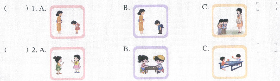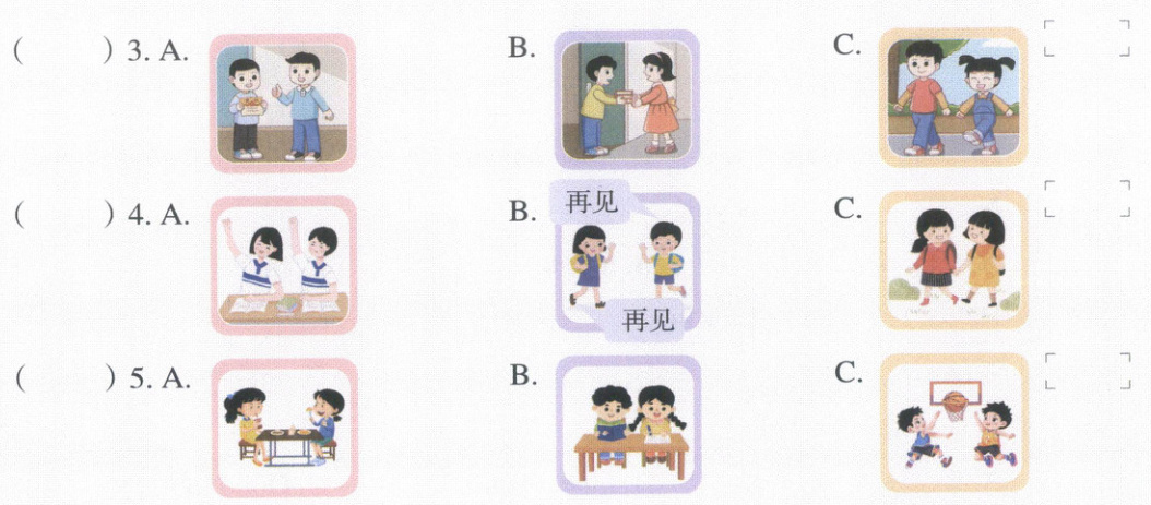 Ⅲ. 李老师在校园里捕捉了一些精彩瞬间。同学们正看着照片讨论着当时发生了什么。根据你所听到的对话,选择对应的图片(每小题2分,共10分)