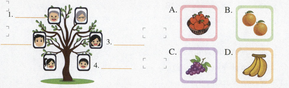 My name is John. I have a happy family. There are six people in my family, my grandpa, my grandma, my dad, my mum, my sister and me. My grandpa likes bananas and oranges. He doesn’t like grapes. My grandma likes oranges. My dad likes grapes and oranges. My mum likes apples and oranges. My sister likes oranges and bananas. I like oranges and grapes, but I don’t like bananas.
