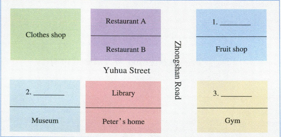 任务一:根据短文内容,将下面的地图补充完整。(每小题 2 分,共 6 分)