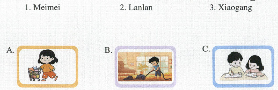 任务一:根据短文内容,将以下三名同学与其做的事情连起来。(每小题 2 分,共 6 分)