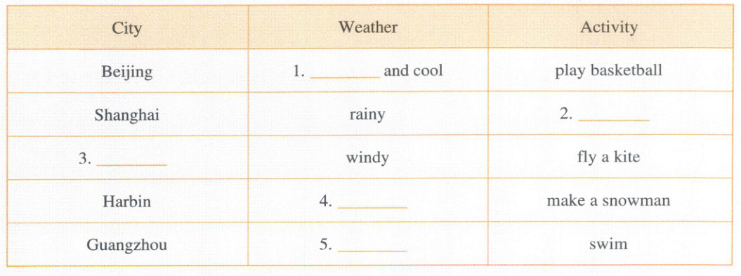 1.cloudy 2.read books 3.Dalian 4.snowy 5.sunny