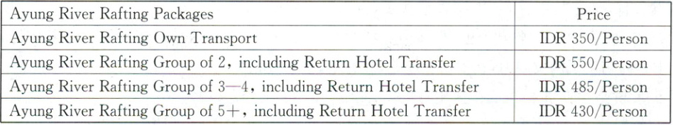 2. C 细节理解题。根据 Prices 部分表格中的"Ayung River Rafting Group of 3—4, including Return Hotel Transfer"和"IDR 485/Person"可知,回程包括酒店接送的 4 人团需要支付 485×4=1940 印尼盾。故选 C。