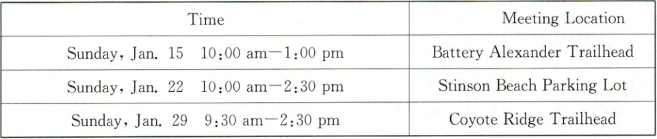 | Sunday, Jan. 15 10:00 am - 1:00 pm | Battery Alexander Trailhead |