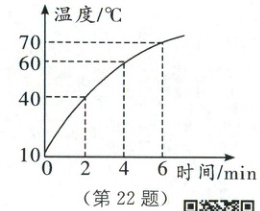 22. (5分)某物理兴趣小组的同学,用煤炉给100 kg的水加热,同时他们绘制了如图所示的加热过程中水温随时间变化的图像,若在6 min内完全燃烧了2 kg的煤,煤的热值约为$3×10^7 J/kg.[c$水$= 4.2×10^3 J/(kg·℃)]$求: